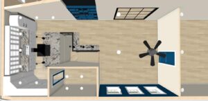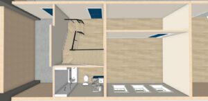 In the first floor living area, there is ample space for mechanicals, segregated into its own room. This will provide sound management for the aircompressor. Across the foyer from the mechanical closet, is a spacious bedroom and a giant walk-in closet, you know for storying work wear! We managed to fit a full bathroom under the stairs leading to the kitchen and living room.