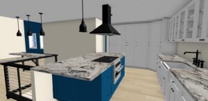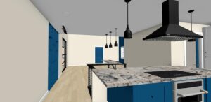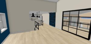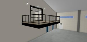 With the 18′ tall eaves, we were able to tuck a small galley style kitchen at the end of the 2nd floor structure while still leaving room for 8′ tall ceilings on the first floor for the bedroom, bathroom (for easy access while working), and mechanical room. The living room will take advantage of the pitched roof with a cathedral ceiling. This leaves an area that can be used as a 2-storey storage facility or converted into additional spaces of their liking.